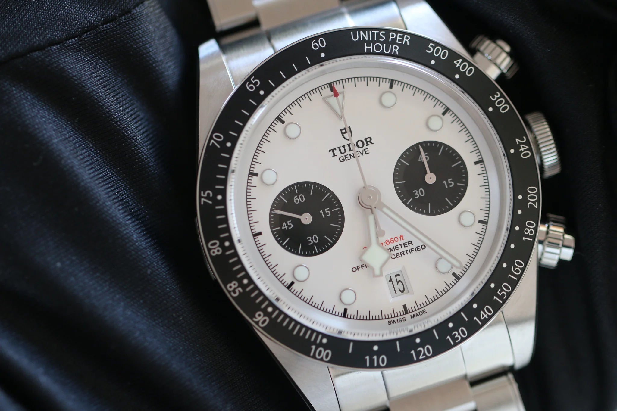 La Tudor Black Bay Chrono 79360N incarne l'esprit sportif raffiné de la maison genevoise. Son cadran blanc ponctué de deux compteurs noirs dessine cette configuration "panda" tant recherchée des amateurs de chronographes à l'esthétique vintage. Une pièce qui conjugue héritage horloger et performances contemporaines.