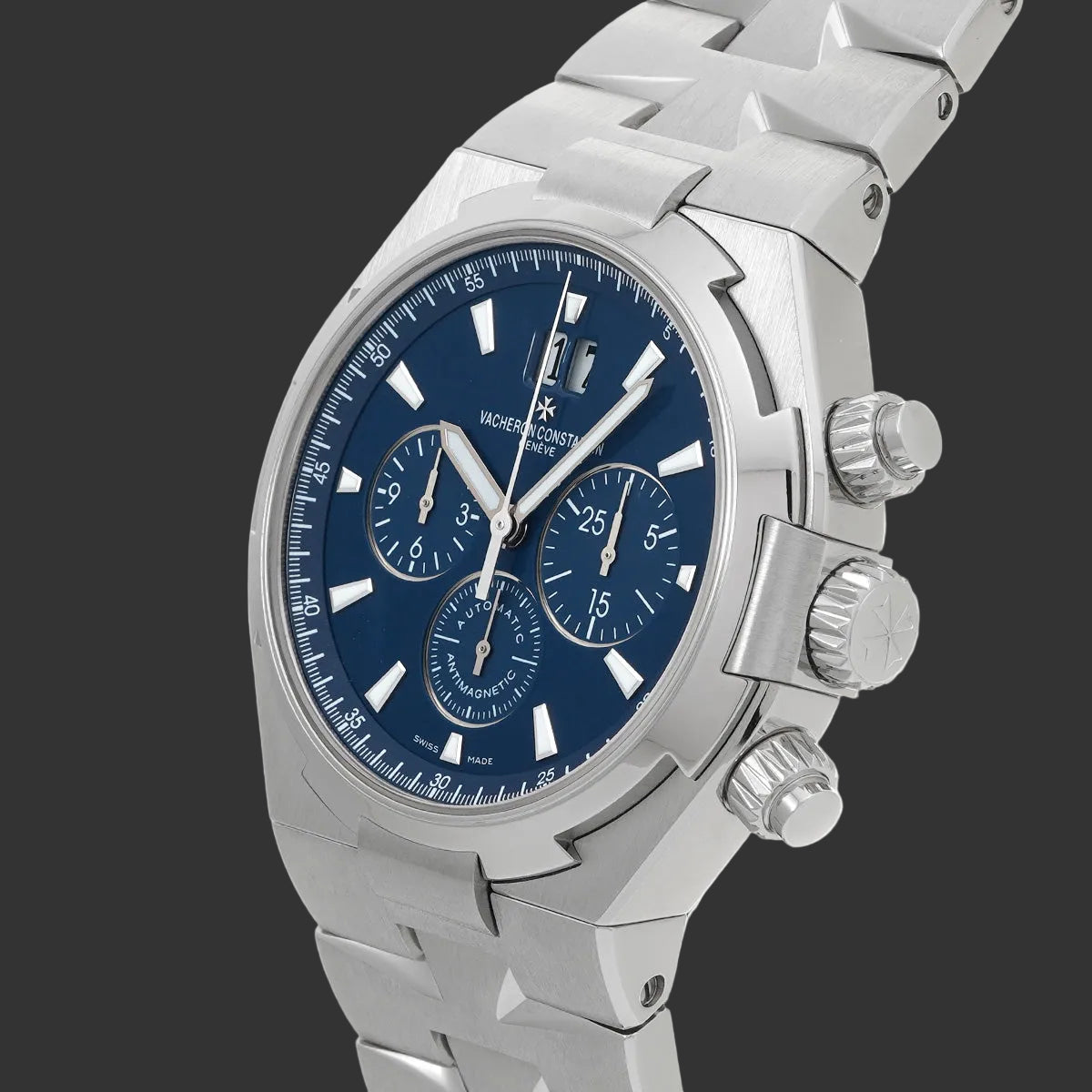 Le boîtier de 42 mm en acier révèle des finitions alternant poli et brossé avec une maîtrise remarquable. La lunette tachymétrique et le bracelet intégré aux mailles sculptées confèrent à cette Overseas une présence affirmée au poignet, sans jamais tomber dans l'excès.