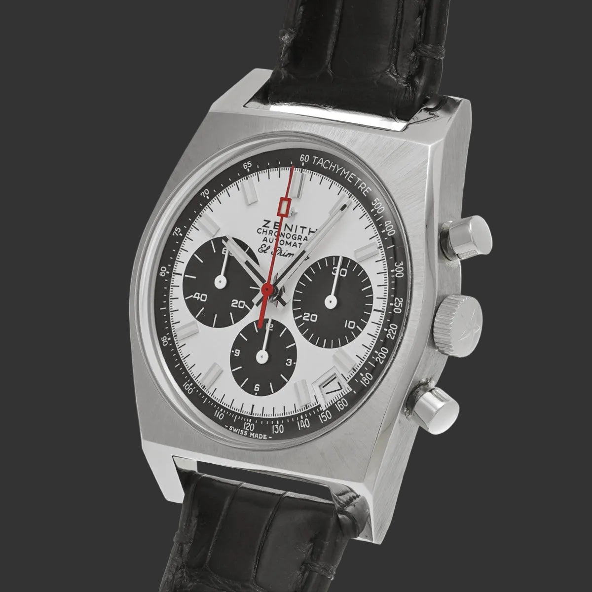 Son cadran blanc orné de trois compteurs noirs crée ce contraste saisissant que les collectionneurs nomment affectueusement « Panda ». L'aiguille centrale rouge vif du chronographe apporte une touche de caractère, tandis que le tachymètre gravé sur rehaut noir affirme sa vocation sportive.
