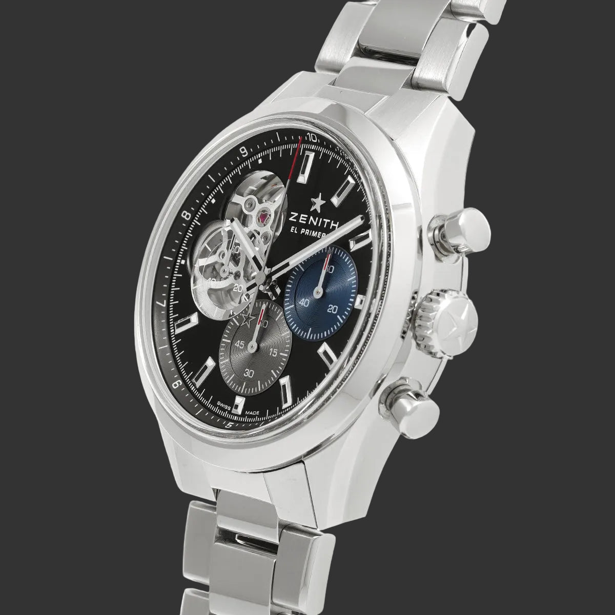 Avec son ouverture cadran révélant le légendaire calibre El Primero, cette Zenith Chronomaster incarne l'excellence chronométrique suisse. Un chronographe de caractère qui allie transparence mécanique et design sportif-chic.